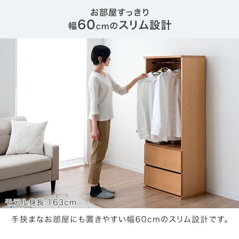引き出し付き ワードローブ 幅60 高さ152 国産 完成品 大川家具 服吊り ハンガーラック クローゼット 衣類ラック 収納 チェスト 収納家具 木製 スリム 【超大型】51300174〔ホワイト〕