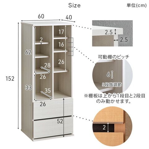 | サイズ | 幅60x奥行40x高さ152cm 引き出し内寸:50×34×16cm |