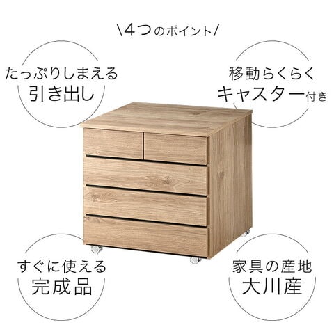 ・引手を隠したフラットデザイン ・ぬくもり感じる木目調 ・届いてすぐに使える完成品 ・出し入れ楽々スライドレール ・移動ラクラク キャスター付き ・日本製(大川家具) |