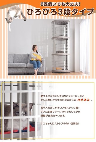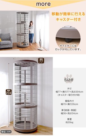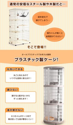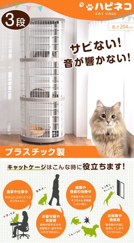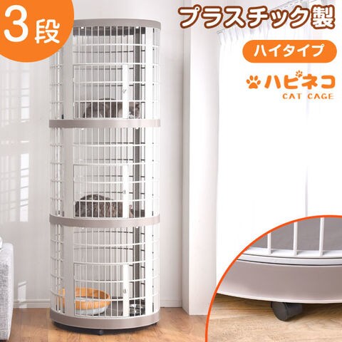 【即納】 キャットケージ 3段 高さ204cm【錆びない 音が響かない】プラスチック製 円型 ロック式 キャスター付 ホワイト×ブラウン 52800003