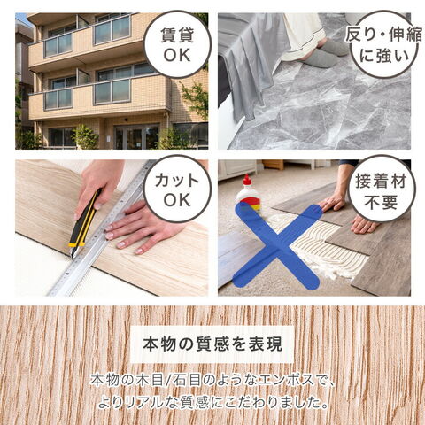 | ・置くだけでカンタン設置! ・おしゃれな木目調/大理石調デザイン ・カッターでお部屋に合わせてカットOK ・賃貸OK&繰り返し使える ・お店やオフィスにも使える土足対応タイプ ・シックハウス症候群の原因物質7種をしっかり検査 ・床にピタッと吸着する滑り止め付き! |