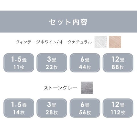 【ヴィンテージホワイト/オークナチュラル】 幅122×長さ18.5cm(厚み4mm) 約1.5畳分:11枚入り 約3畳分:22枚入り 約6畳分:44枚入り 約12畳分:88枚入り 【ストーングレー】 幅60×長さ30cm(厚み4mm) 約1.5畳分:14枚入り 約3畳分:28枚入り 約6畳分:56枚入り 約12畳分:112枚入り |
