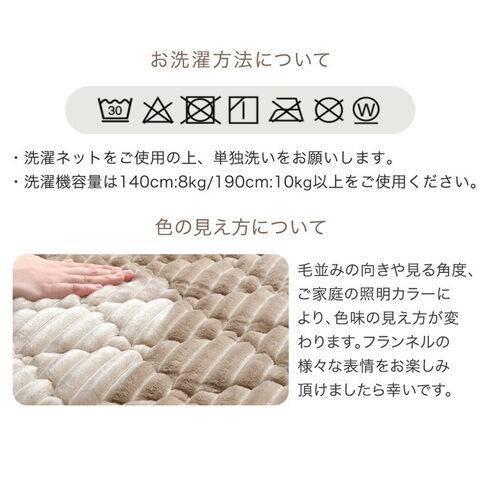 | ※配送は全て宅配便(1人)での玄関渡しとなります。 ※布製品のため、サイズに±5cm程の誤差が生じる場合がございます。 ※折り畳まれた状態での配送となりますので、しわができる場合がございますが、使用しているうちに消えていきますのでご安心ください。 ※乾燥機のご使用はお避けください。 ※ワックスや艶出し材を床面に塗布した場合、完全に床面が乾燥してからご使用ください。 ※床材(塩化ビニル・フローリング等)の材質によって、床のべたつきや色移り、変色が起こる場合がございますのでご注意ください。 | ||