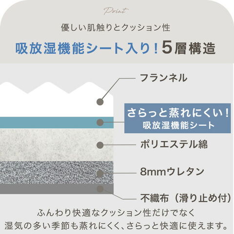 | 表地:ポリエステル100% 中材:ポリエステル100%綿・8mmウレタンフォーム 裏地:不織布ポリエステル100%(滑り止め付) |