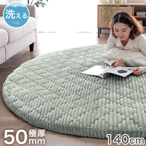 【即納】 極厚50mm 洗える カバーリング ストライプ 140cm 円形 フランネル キルトラグ 床暖房 ホットカーペット対応 ラグマット カーペット 高反発 絨毯 丸型 絨毯 おしゃれ 北欧 6110011414〔セージグリーン〕