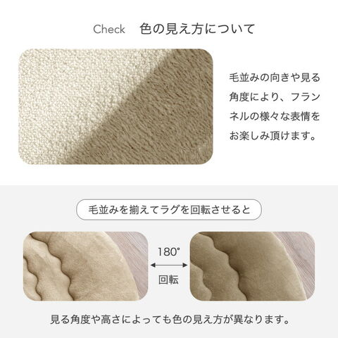 ※配送は全て宅配便(1人)での玄関渡しとなります。 ※開梱直後はラグに折り目がついている場合がございます。 1週間程度で自然になくなりますので、そのまま 床に敷いてお使いください。 ※気温など環境によっては折り目がなくなるまでの時間に差が生じます。冬場の寒いところでは、時間がかかる場合がございますので予めご了承ください。 ※開封直後ににおいが気になる事がありますが、その際には風通しの良い所で陰干しをしてください。 ※素材(染料)の特性上、ご使用中や濡れた状態での摩擦により色移りする恐れがあります。ご使用の際、床材(塩化ビニル・フローリング等)の材質によっては、床がべたついたり、色移りする場合がありますので、以下の点にご注意ください。 ・長期間の同じ場所でのご使用はせずに、定期的に使用場所をずらしたり、床面を拭いてご使用ください。 ・特に、新築の床材やワックスがけ直後のご使用はご注意ください。 ※くつ下や履物を履いて歩くとすべりやすくなることがありますのでご注意下さい。 ※商品ページの色味は、出来る限り実物に近い色で画像を掲載しておりますが、お使いのブラウザー及びモニターや使用環境により、実際の色と多少の差異があります。予めご了承ください。 |