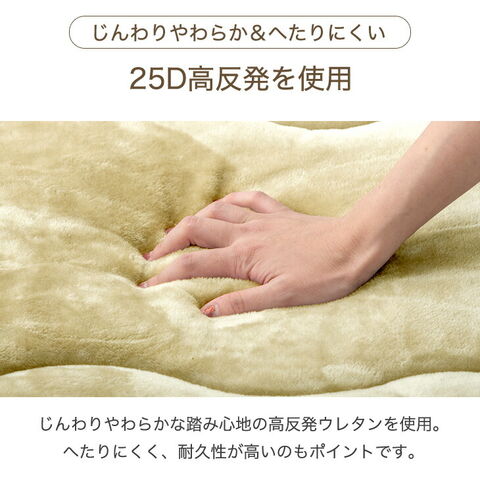 | 素材 | <カバー> 表地・マチ:ポリエステル100%(目付け… 260g/m2) 中材:25D高反発ウレタンフォーム、ポリエステル綿(抗菌防臭防ダニ加工) 裏地:不織布(滑り止め付き) |