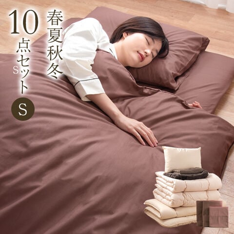 【即納】 オールシーズン使える 布団セット 10点セット シングル ロング 洗える 毛布 タオルケット 肌掛け 固綿 敷き布団 掛け布団 カバー 枕 ふとん 新生活 春 夏 秋 冬 寝具セット ふとんセット 一人暮らし 来客用 26700100〔ブラウン〕