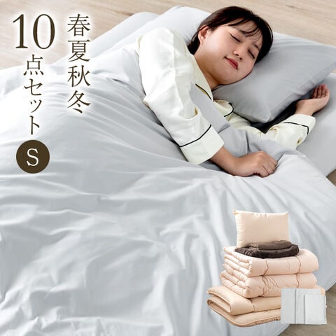【即納】 オールシーズン使える 布団セット 10点セット シングル ロング 洗える 毛布 タオルケット 肌掛け 固綿 敷き布団 掛け布団 カバー 枕 ふとん 新生活 春 夏 秋 冬 寝具セット ふとんセット 一人暮らし 来客用 26700100 〔グレー〕