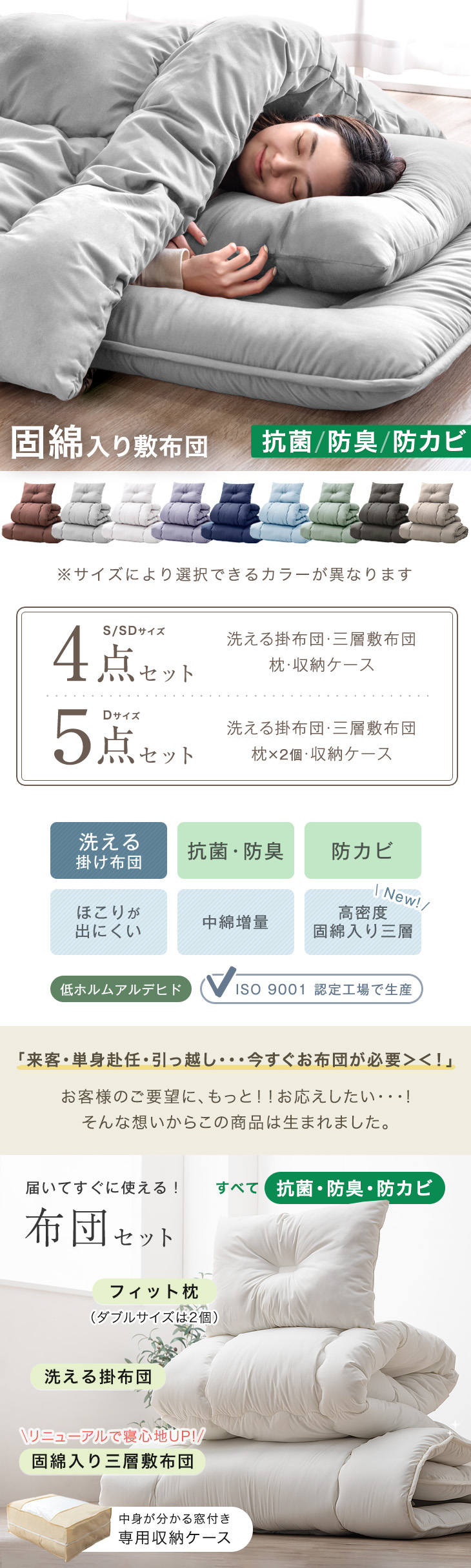 【即納】 布団4点セット シングル 布団セット 増量1.5kg 洗える 抗菌 防臭 防カビ 4点セット 収納ケース付 洗濯OK ほこりが出にくい 敷布団 掛け布団 寝具セット 枕 布団 新生活 61140237〔ペールブルー〕