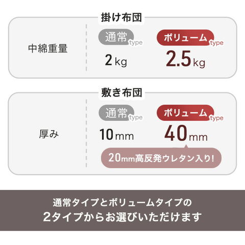 | 中綿重量 | 【通常タイプ】 【ボリュームタイプ】 |