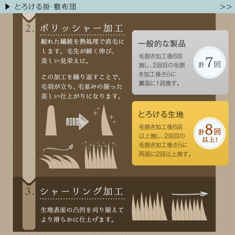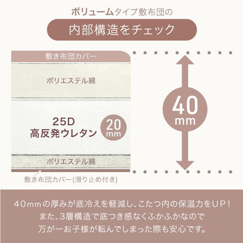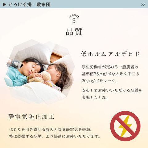 通常タイプ ┗やみつきとろける触感 ボリュームタイプ ┗さらにふかふか贅沢な厚み ・洗濯OKいつでも清潔 ・抗菌/防臭/洗濯耐久性のある帝人 フィルケア(R)綿 ・静電気防止加工でより快適 ・お子様にも安心の低ホルムアルデヒド ・滑り止め付き ・床からの冷気を防ぐウレタン入敷布団 |