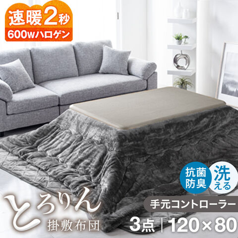 速暖2秒!とろける肌触り こたつ 3点 セット 手元コントローラー付 洗える 掛敷布団 抗菌 防臭 こたつテーブル 長方形 120 こたつセットテーブル 61140533 〔ホワイトウォッシュ+布団:チャコールグレー〕【予約】1月下旬※1/31までに出荷予定