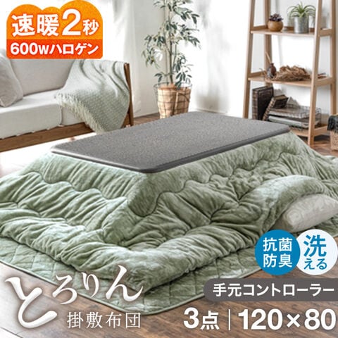 速暖2秒!とろける肌触り こたつ 3点 セット 手元コントローラー付 洗える 掛敷布団 抗菌 防臭 こたつテーブル 長方形 120 こたつセットテーブル 61140533 〔アッシュグレー+布団:モスグリーン〕【予約】1月29日より順次出荷予定