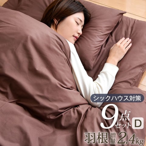 【即納】 布団セット ダブル 羽根布団9点セット 首元まで暖か襟丸 ボリューム 超低ホル 敷き布団 敷布団 フェザー100% 布団 ふとん 掛布団 掛け布団 枕 組布団 洗える カバー付 新生活 61190056 〔ブラウン〕