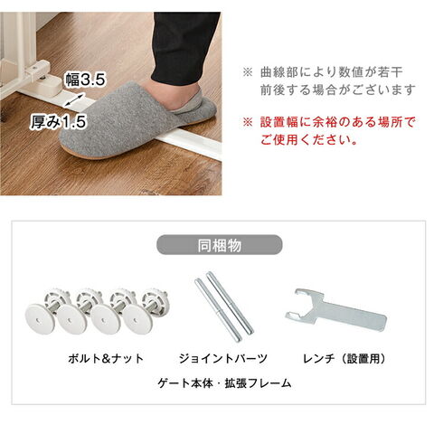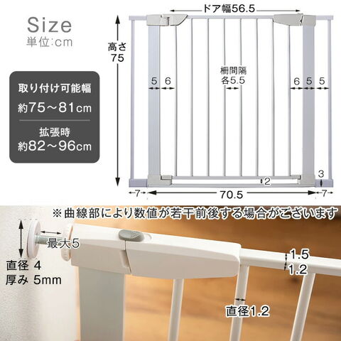 | 【中国製】 ※配送は全て宅配便(1人)での玄関渡しとなります。 ※本製品を使用しているときは、保護者の方はお子様の動作に十分注意を払ってください。 ※階段から落ち怪我をする可能性があるため、階段降り口(階段上)でのご使用はできません。 ※ご使用前に必ず同封の取扱説明書をよくお読みの上、正しくお使いください。誤った使い方をすると、人的または物的損傷を負う可能性が御座います。 ※突っ張る力で支える構造のため、壁紙や壁の材質によっては、商品の設置により破損する場合があります。必ず壁紙や壁の材質、強度を確認してから設置してください。 ※扉は0度以内で手を離すとオートロックできますが、安全のために実際に扉がロックされていることを必ず確認してください。 ※壁や柱が垂直、床面が水平、ゲートの底面が床面にしっかりと設置できる場所で設置してください。 |