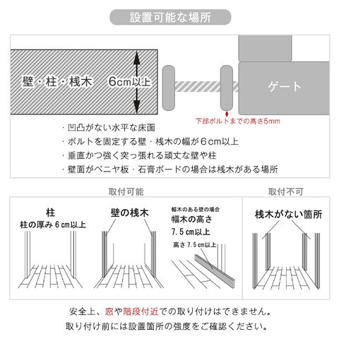 | 【中国製】 ※配送は全て宅配便(1人)での玄関渡しとなります。 ※ご使用前に必ず同封の取扱説明書をよくお読みの上、正しくお使いください。誤った使い方をすると、人的または物的損傷を負う可能性が御座います。 ※本製品を使用しているときは、保護者の方はお子様の動作に十分注意を払ってください。 ※階段から落ち怪我をする可能性があるため、階段降り口(階段上)でのご使用はできません。 ※突っ張る力で支える構造のため、壁紙や壁の材質によっては、商品の設置により破損する場合があります。必ず壁紙や壁の材質、強度を確認してから設置してください。 ※扉は110度以内で手を離すとオートロックできますが、安全のために実際に扉がロックされていることを必ず確認してください。 ※対象年齢外のお子様に使用するとお子様の思わぬ動きにより、重大な事故に繋がる恐れがあります。 ※説明書と梱包にお子様用との記載がございますが、ペット用としてもご使用いただけます。 ※当商品は小型犬、中型犬、大型犬すべての犬種でご利用頂けますが、ワンちゃんが寄りかかったり、勢いよくぶつかったりしますと大きな事故に繋がります。そのような行動が見られた場合はご使用をお止めください。 ※小型犬の場合、隙間からすり抜ける可能性がございます。サイズをご確認の上、ご購入くださいませ。 |