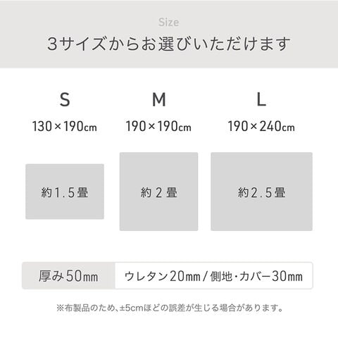 | サイズ | S:幅130×奥行190cm M:幅190×奥行190cm L:幅190×奥行240cm 全サイズ厚み5cm |