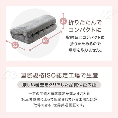 | 素材 | 張地:ポリエステル100% 中材:PP綿、低反発チップウレタン(50D)、ピュアウレタン(16D)、スチールパイプ |
