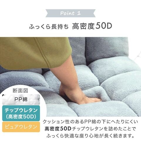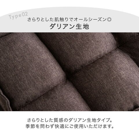 ・選べる2タイプ └ふんわりソフトなマイヤー生地タイプ └おしゃれなパイピング付き!ダリアン生地タイプ ・もこもこキルティングで座り心地◎ ・快適な座り心地が長く続く高密度50Dチップウレタン使用 ・大人かわいいニュアンスカラー ・身体を包み込む3層構造 ・リクライニング14段階 ・折り畳み収納OK ・高い品質と耐久力を誇る日本メーカーのギア使用 ・2万回の衝撃テストに合格 ・品質保証の証 ISO認証工場で生産 |