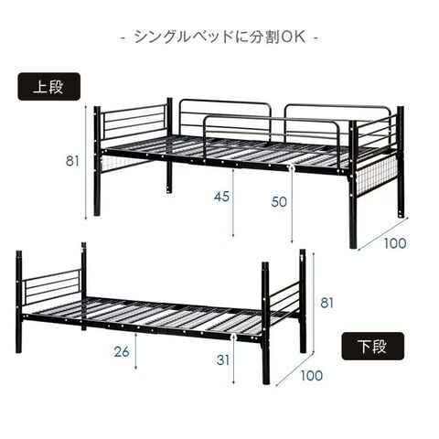 ・寮や子ども部屋にぴったりのコンパクトサイズ ・独自梱包で、時間指定OK ・一段あたり耐荷重300kgの頑丈設計 ・省スペースな垂直はしご仕様 ・ワイヤーメッシュで通気性抜群 ・はしごは左右どちらにも配置可能 ・上下段を分けてシングルベッドとしても |