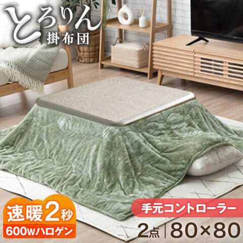 速暖2秒!600Wハロゲンヒーター とろける こたつ 2点セット 80×80 手元コントローラー 洗える 掛布団 抗菌 防臭 正方形 こたつ布団 コタツ テーブル 座卓 68140120 〔ホワイトウォッシュ×布団:モスグリーン〕【予約】12月下旬※12/31までに出荷予定