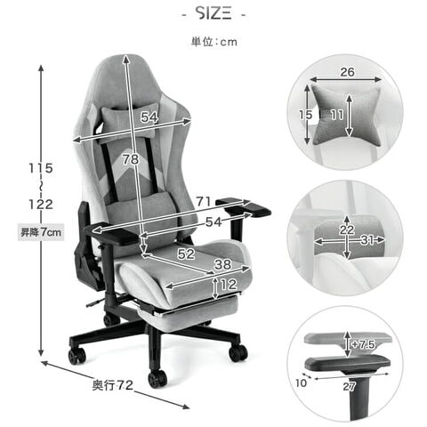 | 外寸:幅71×奥行72?164×高さ115?122cm 座面高:43?50cm 重量:約21kg / 耐荷重:約150kg |