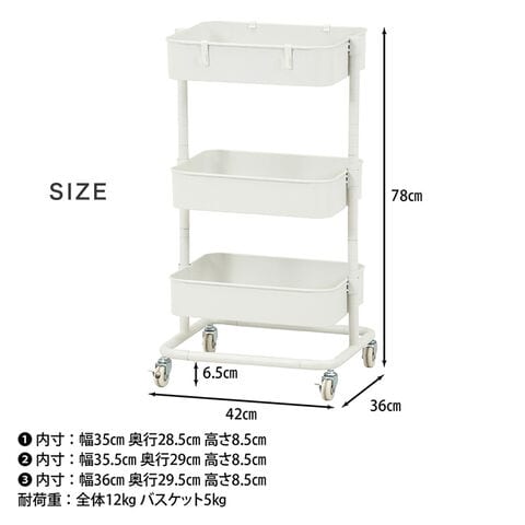 ※バスケット1個(単体)に物をのせた場合の耐荷重は約5kgですが、組みたてした際のフレームのたわみ率やキャスターへの負荷考慮して全体の推奨耐荷重を12kgとしています。 |