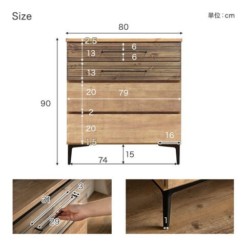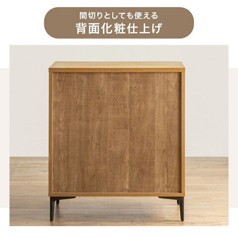 | 素材 | 天板:強化紙化粧繊維板 前板:天然木(パイン/オイル塗装仕上)、強化紙化粧繊維板 引き出し:桐材 脚:スチール 背面:プリント紙化粧繊維板 |