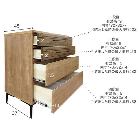 | 耐荷重 | 天板:約30kg 引き出し1~2段目:10kg 引き出し3~4段目右:15kg |