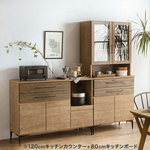 ヴィンテージ調 キッチンカウンター 国産 完成品 幅120 カップボード レンジ台 キッチンボード 食器棚 ロータイプ キッチン収納 レンジ 引き出し 間仕切り 天然木 大川家具 おしゃれ【超大型】7080001100