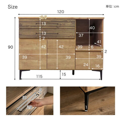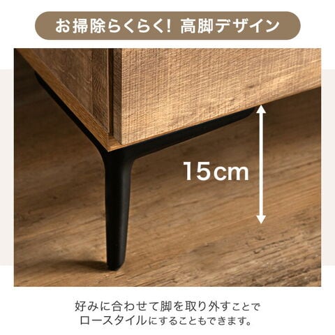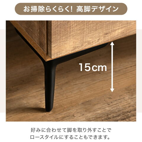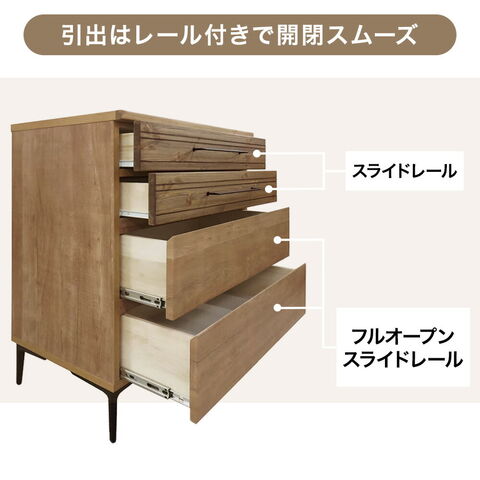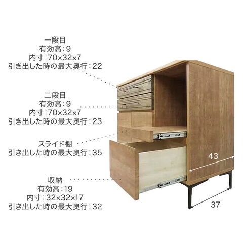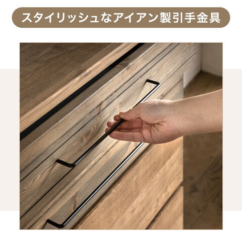| 素材 | 天板:強化紙化粧繊維板 前板:天然木(パイン/オイル塗装仕上)、強化紙化粧繊維板 引き出し:桐材 脚:スチール 背面:プリント紙化粧繊維板 |
