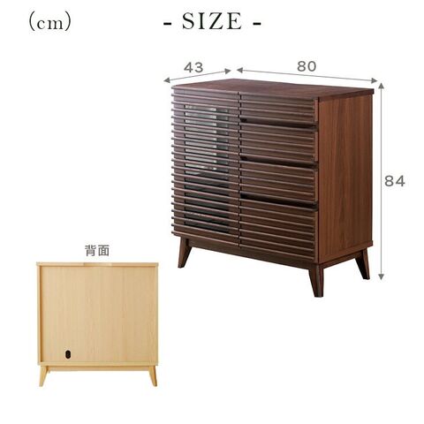| 外寸:幅80cm奥行43cm高さ84cm 【収納部】 引出し(1段目):幅33.5cm奥行32.5cm高さ7cm 引出し(2-3段目共通):幅30.5cm奥行32cm高さ15.5cm 引出し(4段目):幅33.5cm奥行32.5cm高さ12.5cm 扉:幅36cm奥行32.5cm高さ64.5cm |