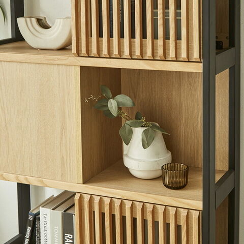 | スタッフのんのおすすめポイント | ・空間をオシャレに飾り付ける間仕切りシェルフ ・前からでも後ろからでも物が取り出せる両面収納 ・飾り棚やブックシェルフなど幅広く活躍 ・扉は引き戸だから狭いスペースでも開閉らくらく ・奥行き32cmの省スペース設計 ・お掃除ロボット対応 |
