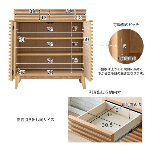 | 天板:天然木化粧繊維板 前板:アッシュ無垢、天然木化粧繊維板 側板:プリント化粧繊維板 内部:プリント化粧繊維板 脚部:アッシュ無垢 |