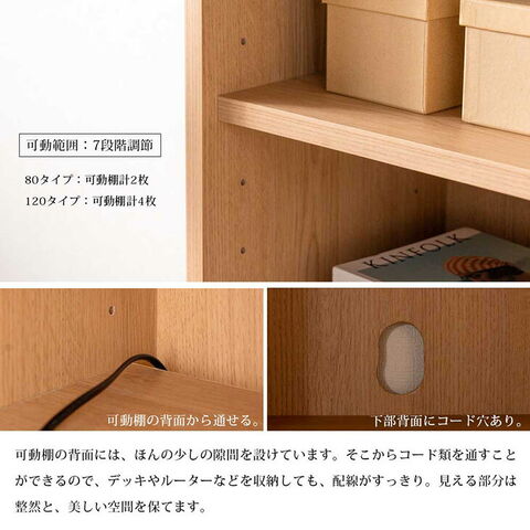 | 耐荷重 | 【幅80/120共通】 天板:約60kg 固定棚、可動棚:各箇所約5kg |