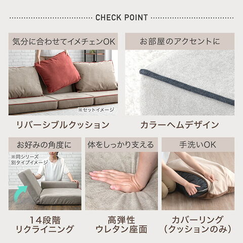 ・気分に合わせてスタイルチェンジ! リバーシブルクッション ・おしゃれなカラーヘムデザイン ・14段階リクライニング ・身体をしっかり支える高弾性ウレタン座面 ・クッションカバーは外して洗濯OK ・1年中快適なファブリック生地 |