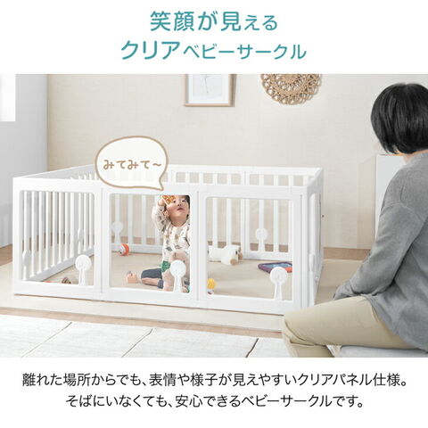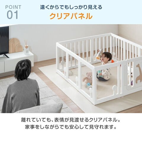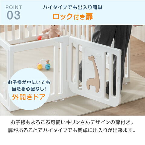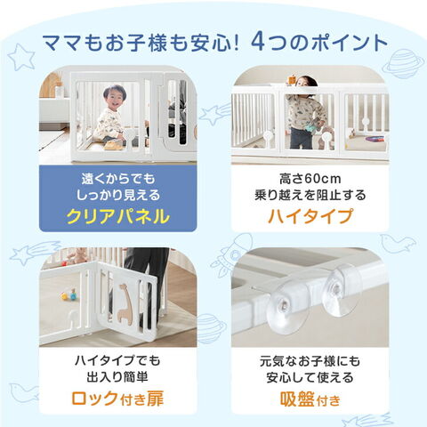 ・顔が見えて安心!クリアベビーサークル ・ドアは可愛いキリンデザイン ・工具不要で設置簡単!ジョイント式 ・ズレを防止する吸盤付き ・安心のロック付きドア ・やさしい丸角設計 |