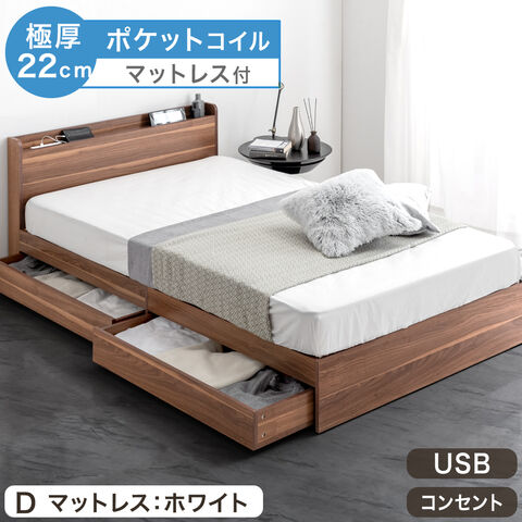 ベッド マットレス付き 収納付き ダブル すのこ ポケットコイルマットレス スマホスタンド USB コンセント付き マットレス付 引き出し付き ベッドフレーム 収納 マットレスセット 73400028 〔ベッド:ウォールナット【マット:ホワイト】〕