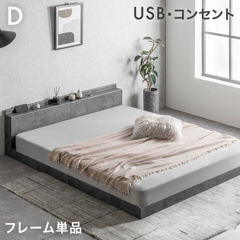 ローベッド すのこ ダブル ベッド フレーム USB・コンセント&スマホスタンド付 宮棚 連結 ロータイプ コンセント 宮付き すのこベッド フロアベッド 連結ベッド 73400035 73400142〔ストーンブラック〕【予約】6月上旬※6/10までに出荷予定