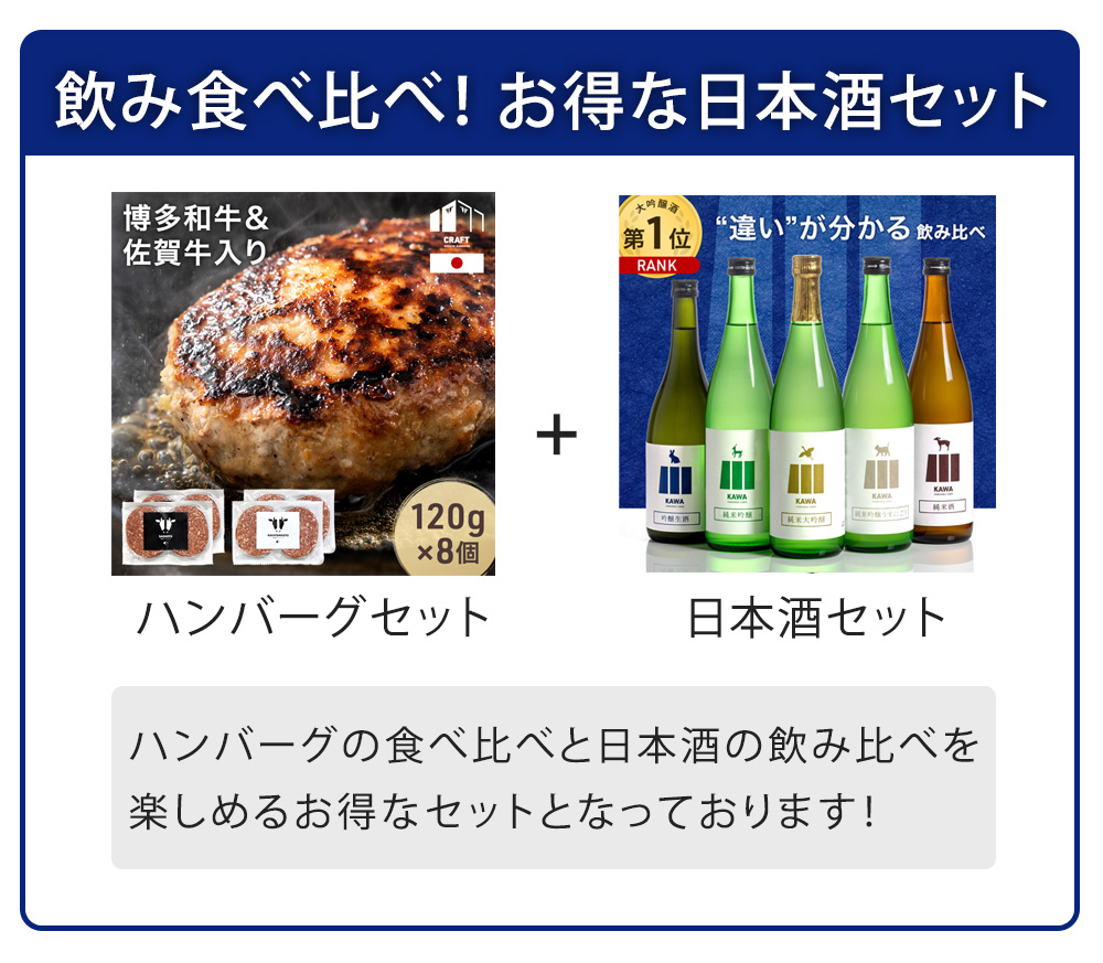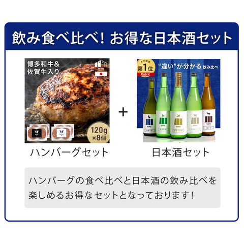 【お得セット】 国産 ハンバーグ 食べ比べ 8個 + 日本酒 飲み比べ 720ml 5本 セット 佐賀牛 博多和牛 入り 120g 冷凍 冷凍ハンバーグ 和牛 牛肉 肉 挽肉 純米大吟醸 純米吟醸 詰め合わせ ギフト 敬老の日 99900981【予約】12月下旬※12/31までに出荷予定