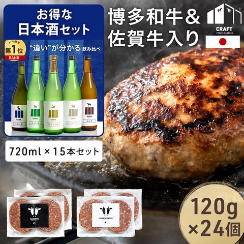 【お得セット】 国産 ハンバーグ 食べ比べ 24個 + 日本酒 飲み比べ 720ml 15本 セット 佐賀牛 博多和牛 入り 120g 冷凍 冷凍ハンバーグ 和牛 牛肉 肉 挽肉 純米大吟醸 純米吟醸 詰め合わせ ギフト 敬老の日 99900983【予約】12月下旬※12/31までに出荷予定