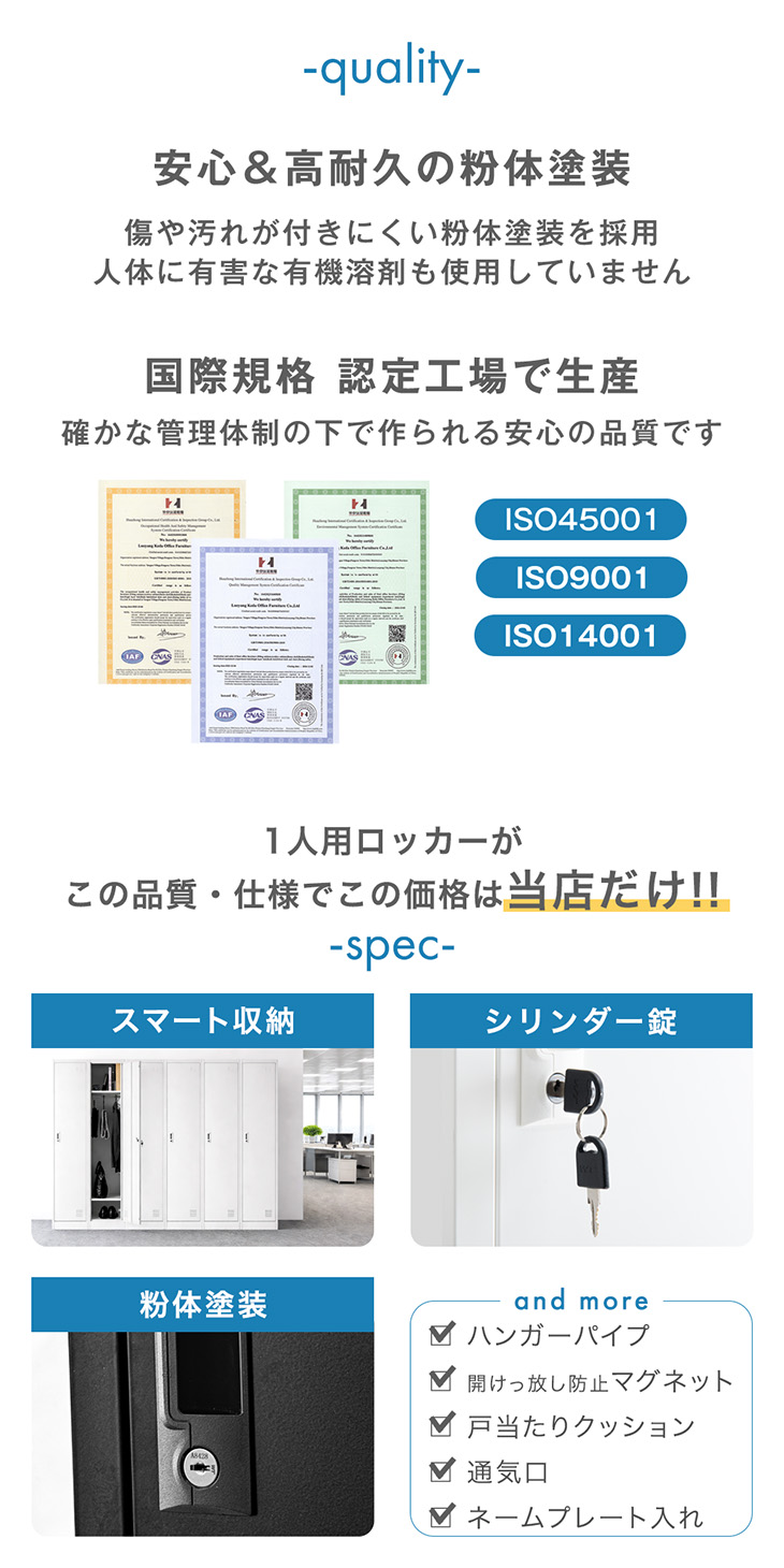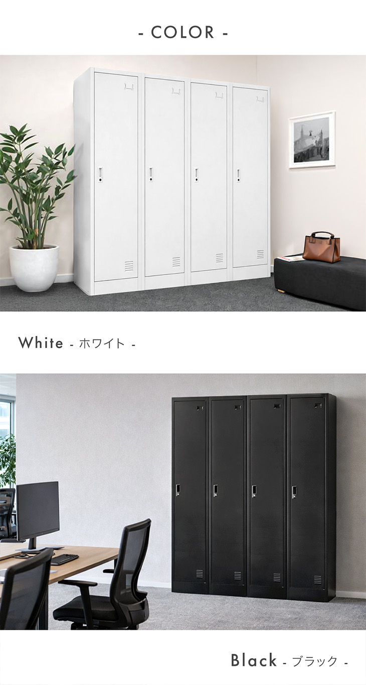 ・省スペースに設置できるスリムサイズ ・ネジがいらない簡単組み立て ・シリンダー錠付きでセキュリティ面も安心! ・衣類や小物をかけられるハンガーパイプ付き ・用途に合わせて分けられる収納 ┗帽子や小物が置ける上棚 ┗かばんやリュックが置ける中棚 ┗靴や消臭剤などが置ける下棚 ・空気がこもりにくい通気口付き ・扉を閉じる際の金属音を緩和する戸当たりクッション付き |