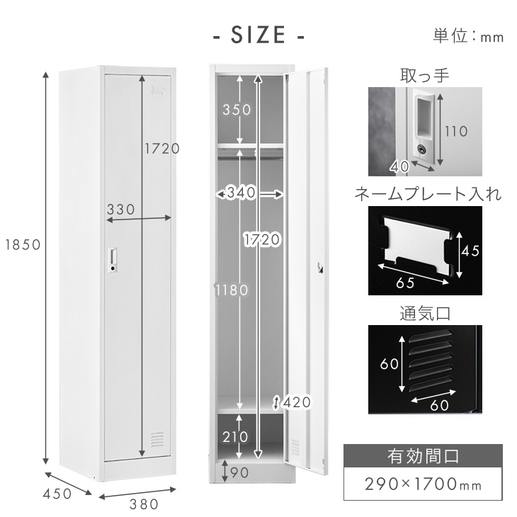 【新発売プライス】 ロッカー 1人用 ★法人様限定★ スリム 1列1段 幅38 奥行45 高さ185 高耐久 シリンダー錠 ハンガー 更衣室 鍵付きロッカー 業務用 収納 スチール製 オフィス収納 省スペース 77400021〔ホワイト〕
