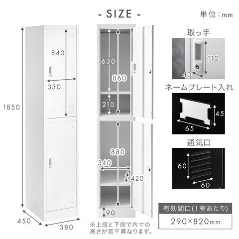 | サイズ | 外寸:幅380x奥行450x高さ1850mm 内寸(1室あたり):幅340x奥行420x高さ860mm |