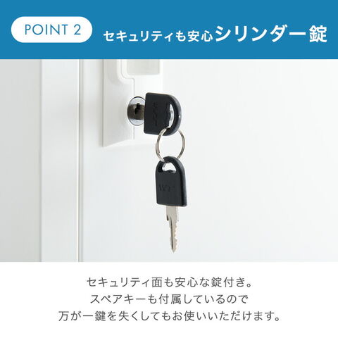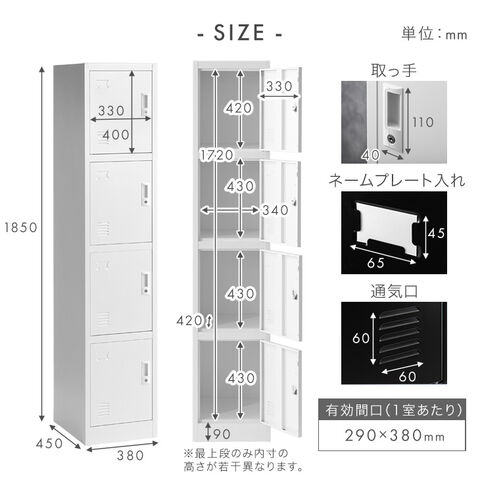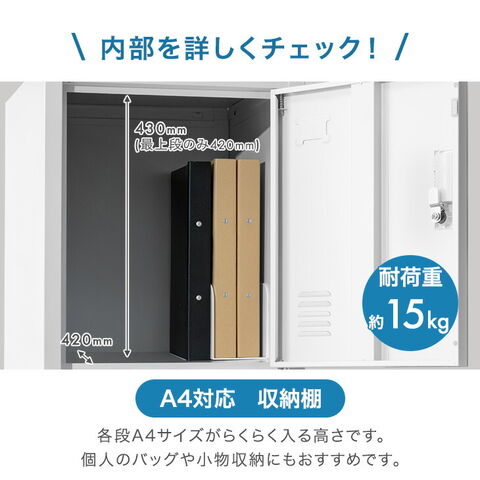 ・省スペースに設置できるスリムサイズ ・ネジがいらない簡単組み立て ・シリンダー錠付きでセキュリティ面も安心! ・A4サイズもらくらく入る4段収納 ・空気がこもりにくい通気口 ・扉を閉じる際の金属音を緩和する戸当たりクッション付き |
