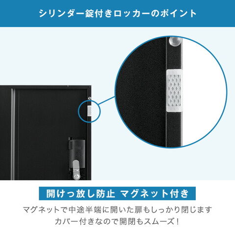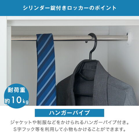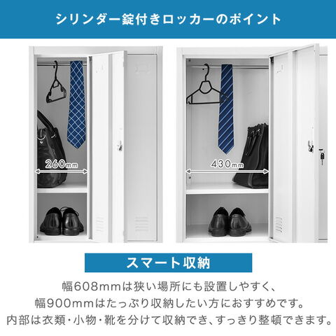 ・選べる2タイプ ┗狭い場所にも設置しやすい幅608mm ┗たっぷり収納できる幅900mm ・シリンダー錠付きでセキュリティ面も安心! ・便利な中板付き ・衣類や小物をかけられるハンガーパイプ付き ・通気口付きで通気性UP ・扉を閉じる際の金属音を緩和する戸当たりクッション付き |