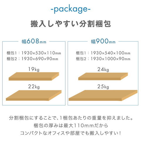 【幅608mm】 梱包1:約19kg 梱包2:約22kg 【幅900mm】 梱包1:約24kg 梱包2:約25kg |