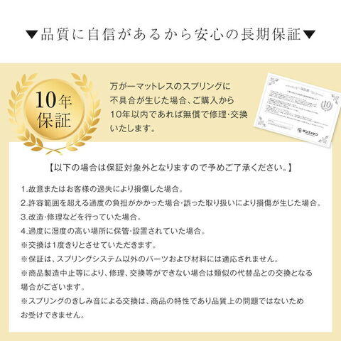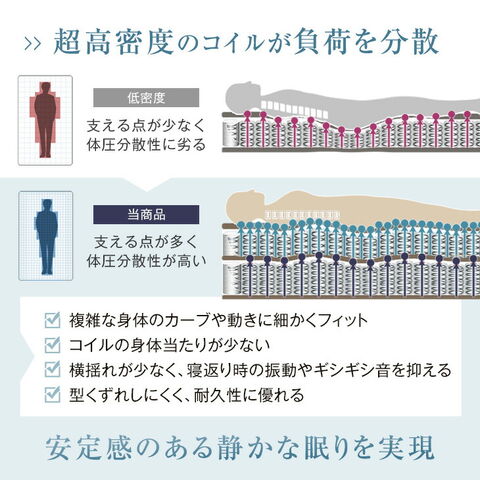 ・上質な寝心地を実現 超高密度Wポケットコイル ・もっちり弾力のあるラテックスウレタン入りピロートップ ・理想の寝姿勢で体圧分散 ・通気性抜群の側面3Dメッシュ ・ハイクラスの『SWRH 72B C種』コイル使用 ・型崩れしにくい エッジサポート ・上質な肌触りのカシミヤ入りニット生地 ・包み込まれるような寝心地 ジャンプキルト ・清潔に使える抗菌 防臭 防ダニ加工 ・耐久性UP 両面仕様 ・ローテーションしやすい上下2分割 ・ずれを気にせず眠れる 滑り止め付き ・搬入が楽な圧縮梱包 ・安心の品質10年間保証 |