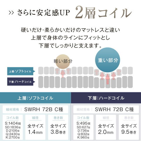 | コイル詳細 | 全サイズ共通 【上段】 巻き数:3.8巻 線径:1.4mm 線材規格:SWRH 72B C種 【下段】 巻き数:9.5巻 線径:2.0mm 線材規格:SWRH 72B C種 【コイル数】 シングル 上段:1404個/下段:495個 セミダブル 上段:1836個/下段:627個 ダブル 上段:2106個/下段:736個 クイーン 上段:2430個/下段:832個 キング 上段:2700個/下段:960個 |